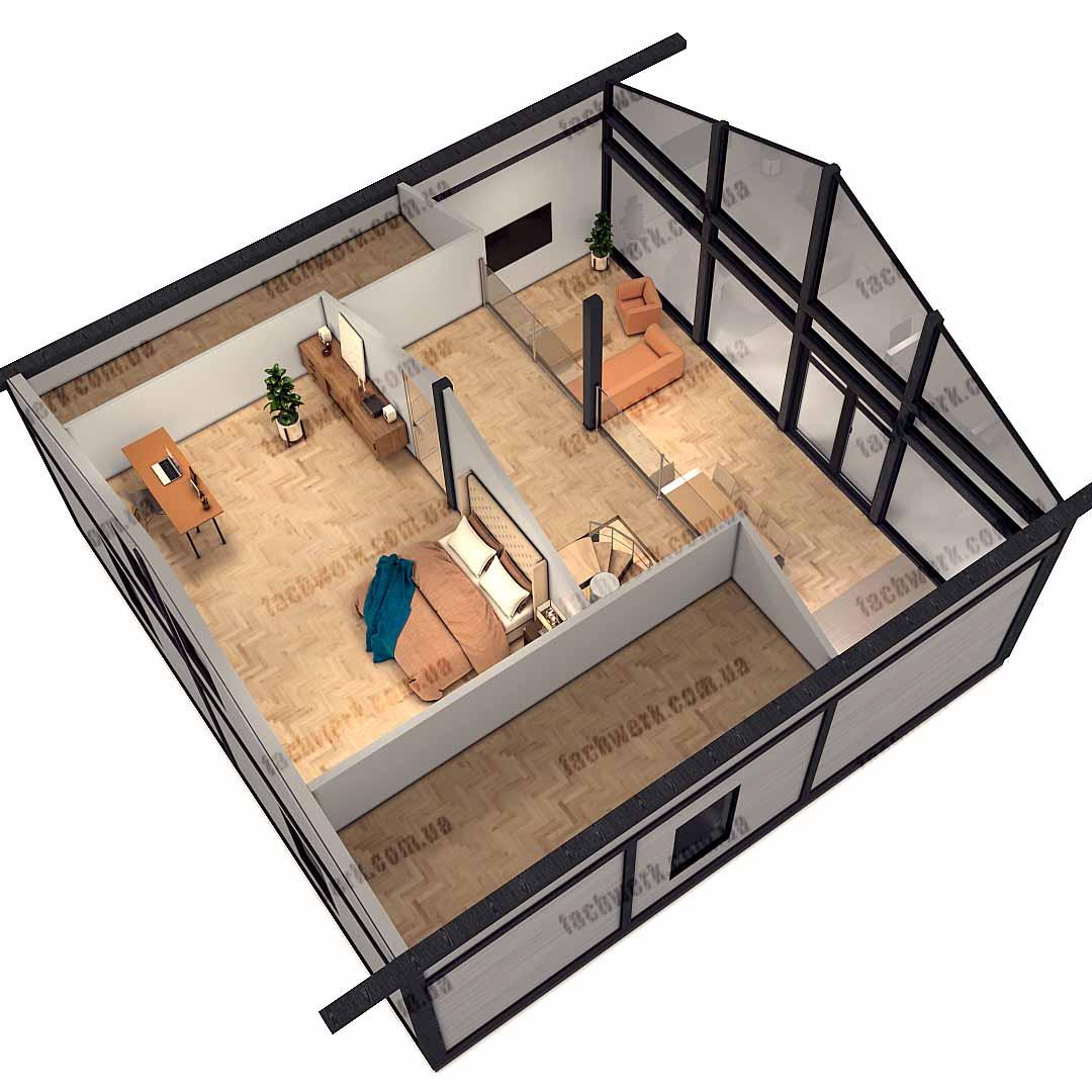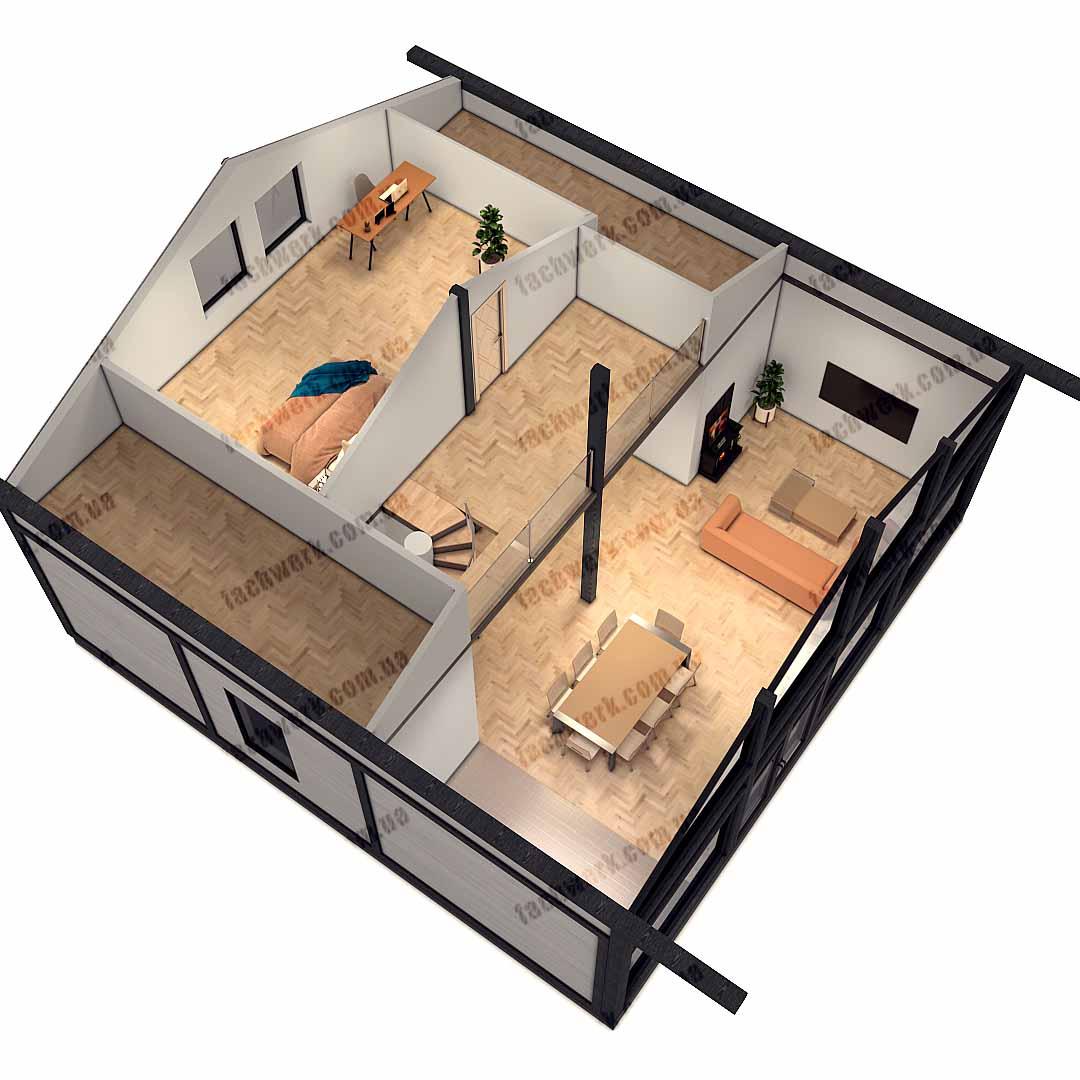 Всі переваги фахверкового будинку присутні - велика вітальня з другим світлом, панорамними вікнами, зручна тераса з виходом з кухні-студії, другий поверх –простора кімната-студія з місцем зберігання речей.