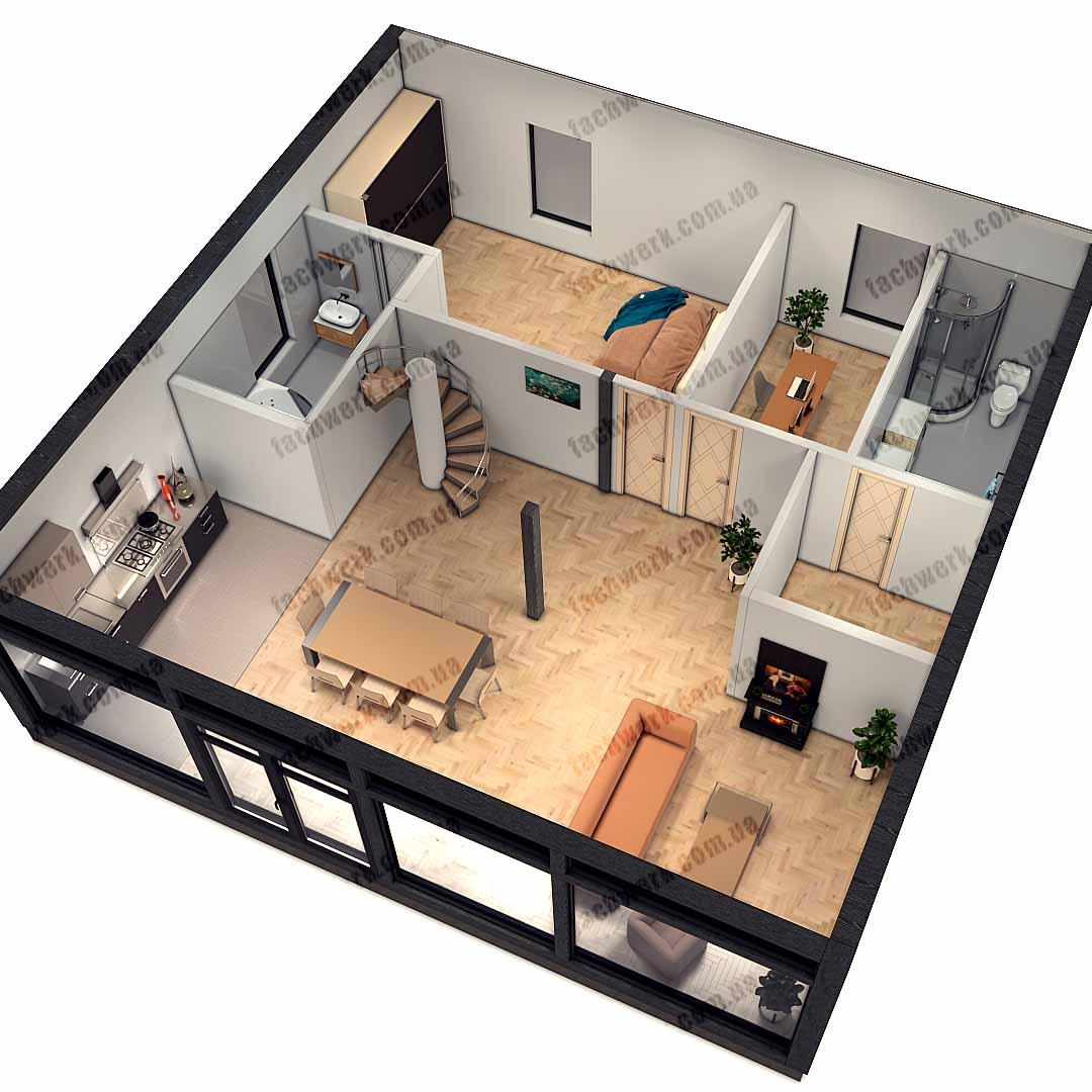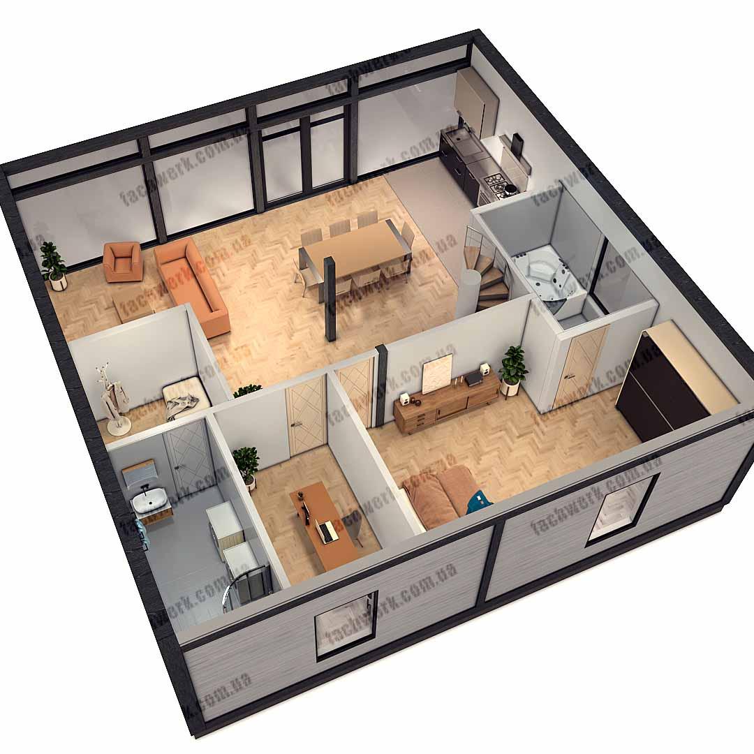 Стандартні розміри будинку 10Х10 метрів, дуже розширюються завдяки вітражному склінню відпідлоги до стелі, що робить на багато просторішим помешкання, за суттєвої економії опалення, кондиціювання, а "друге світло" створює максимально природне освітлення вітальні, їдальні, кухні.