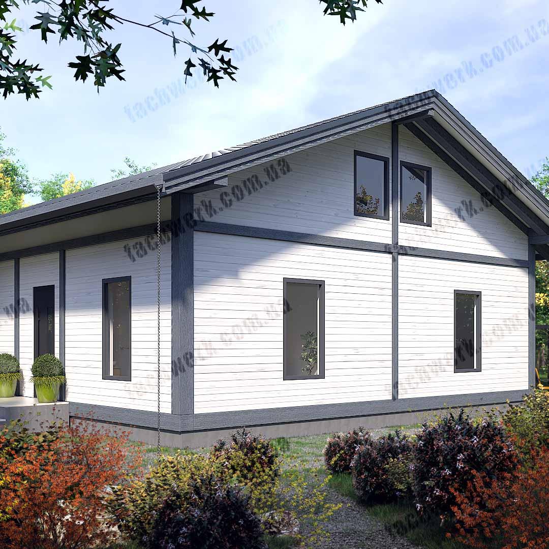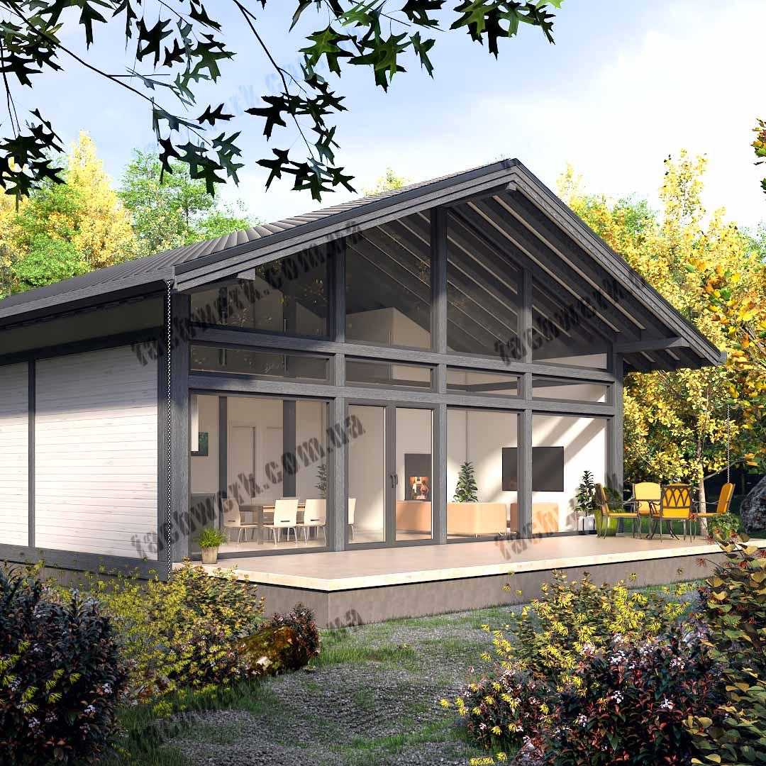 Це каркасно-фахверковий будинок в стилі Шале для сім'ї 4+ мешканців постійного мешкання. Особливість проекту- це змішана технологія, яка поєднує в собі переваги фахверкового будинку , але за суттєво менші кошти, де скляна частина будинку з клеєного брусу з панорамними вікнами, а всі інші – з сухого струганого дерев’яного масиву.